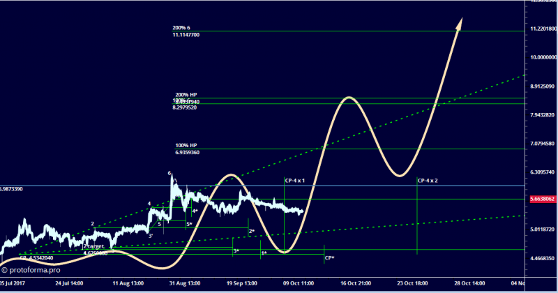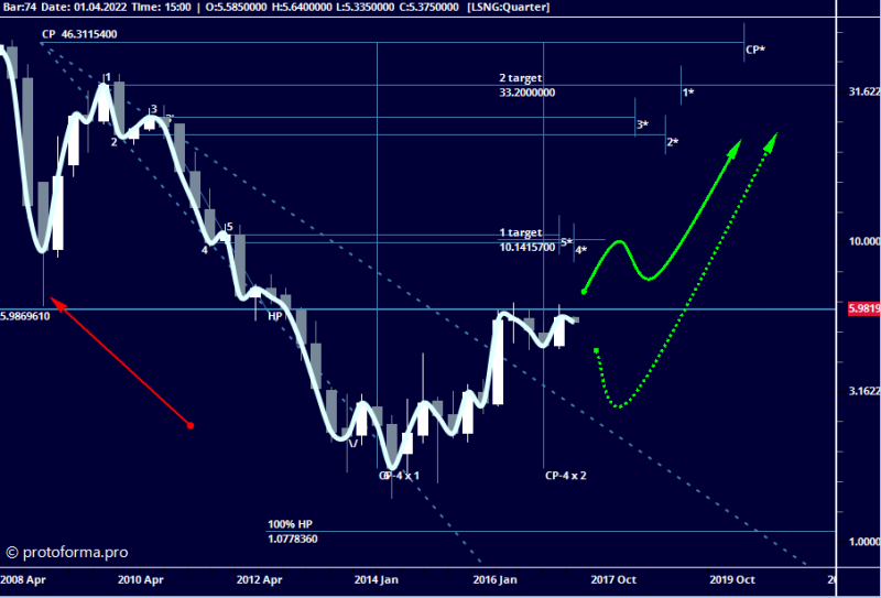 С позиций Тактики Адверза. Цена тестирует сильный квартальный уровень 6.12 и в этом же районе уровень НР модели расширения 5.98 при пробое возможно аповое движение в район 10.14, если не пробьёт то по второму сценарию: