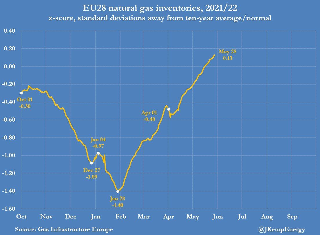 Напоследок обратим внимание на график: пока ЕС одной рукой отказывается от нефти из РФ, другой — набирает российский газ в хранилища рекордными темпами за всю историю наблюдений.