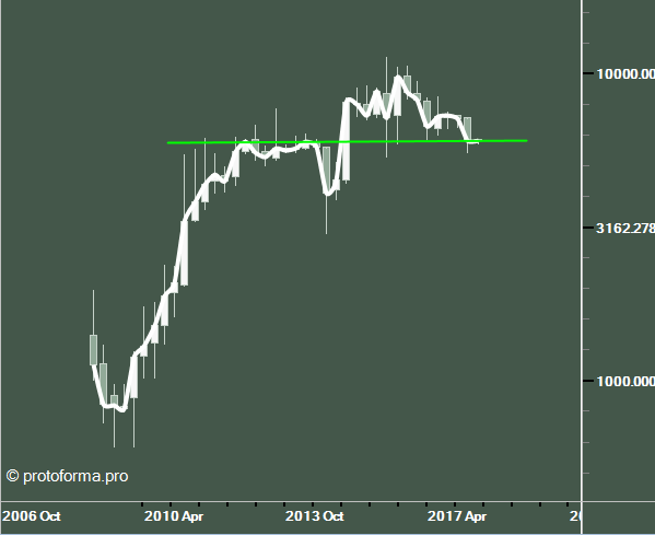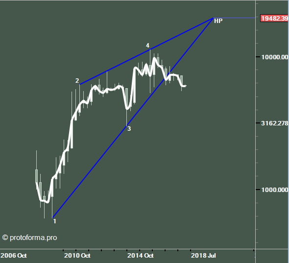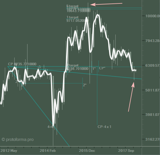 Кроме этого хотел обратить внимание на особенность отработки целей тенями свечей моделей построенных на графике по ценам закрытия. Рассмотрим МР ( модель расширения ) т.4 = т.6, которая была в своё время от начала даун тренда. Обратите внимание что ни 3-я ни 5-я цель не была достигнута и нет в моменте касания трендовой ( цена как бы парит над трендовой ) на этом виде графика ( месяцы ):