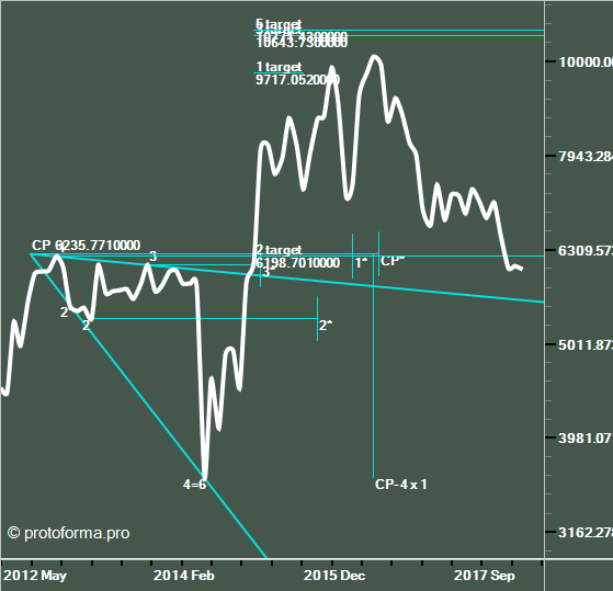 сейчас цена «барахтается» между ЛТ ( линией тренда ) и т. 1 этой модели. Хороший вход на бай в случае закрытия месяца над точкой один, - уровнем 6200.