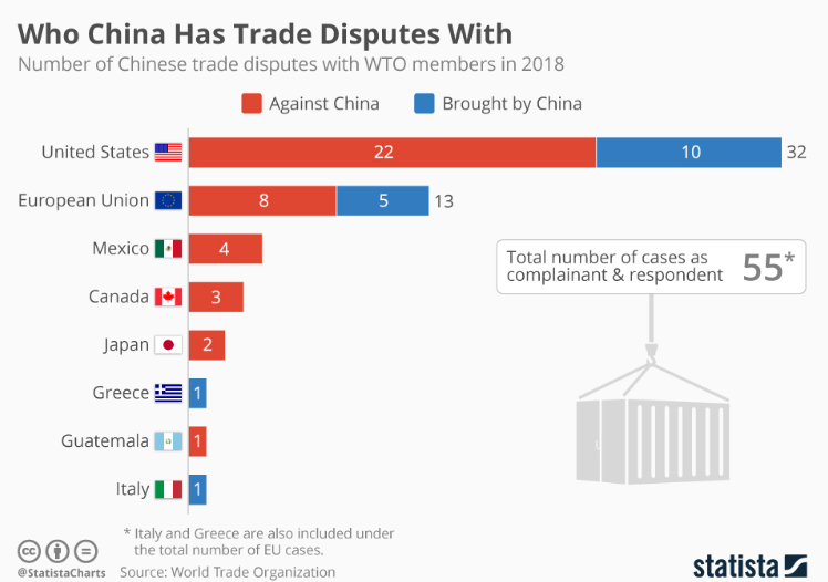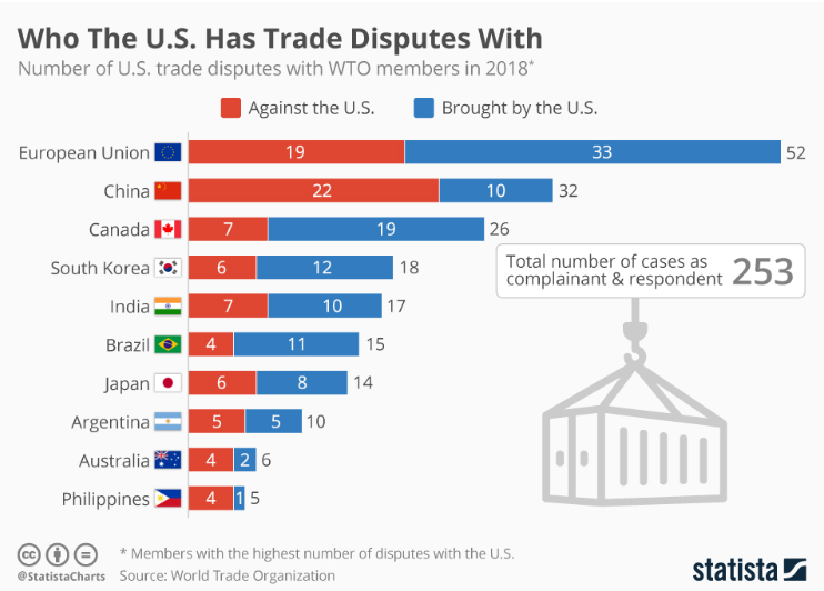 Как видим все говорят о торговой войне между Китаем и Штатами. Но наибольшее количество неразрешённых споров на данный момент приходится на отношения США и ЕС.