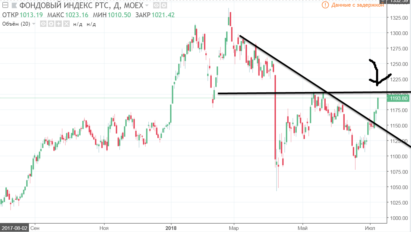 Индекс ртс вышел к своим хаям показанным весной этого года. Это уровень 1200 который теперь выступает в качестве сопротивления. Так же индекс уже далеко оторвался от пробитого тренда, пробой которого состоялся в район 1150. От сопротивления возможен откат с целью протестировать пробитый тренд в район 1150-1170.