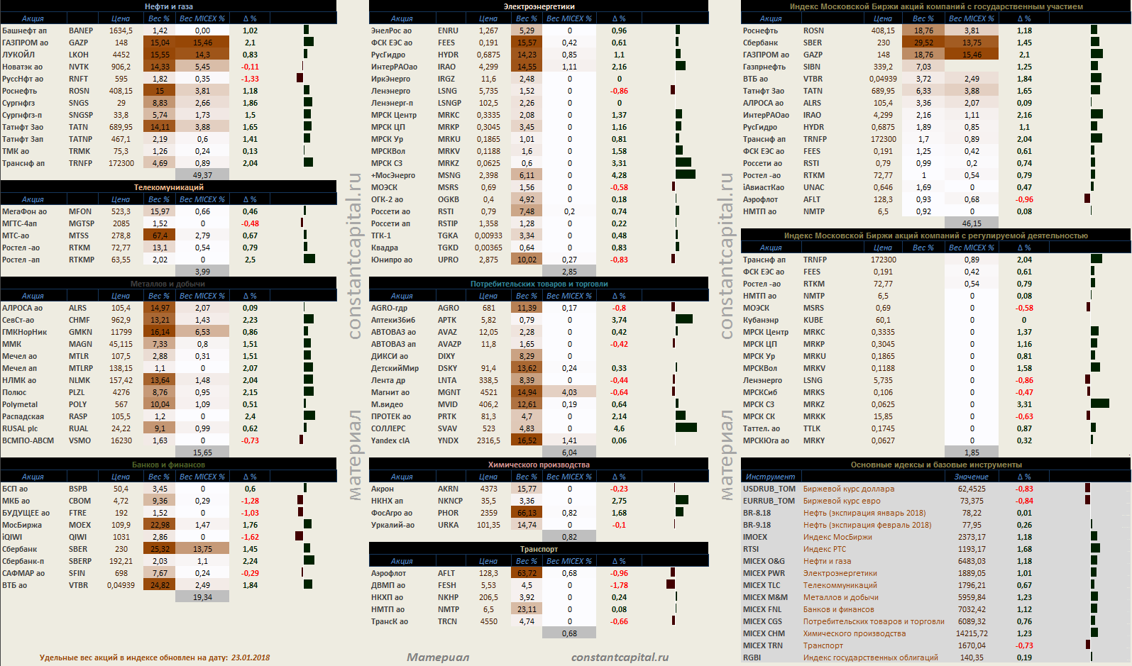 Динамика акций за текущий день, в структуре отраслевых индексов, и индексов государственного сектора.