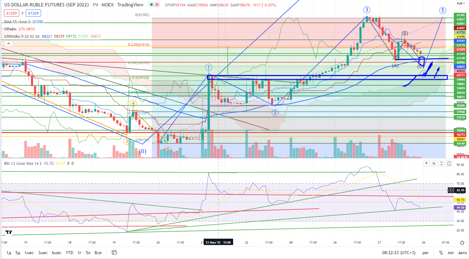 В SIU2 на днях примерно аналогичная картина, на часах сразу скажу, что идеальная зона для откупки 59738-60000, но идеала может не случиться. RSI уже близок к зоне перепроданности, есть временная остановка в районе 61000+-, +55EMA примерно там же...Буду принимать решение по ситуации, но основную часть буду откупать в зоне 59738-60000 с общим стопом 59500-