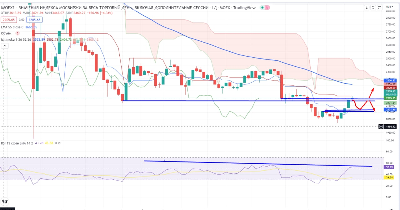 В Сбере наблюдается снова неоднозначная картина. На днях он стоит под уровнем 134 (+55ЕМА), но на часах есть уже дивергенция на хаю. Возможен откат к зоне 128,6-130 (+55ЕМА, но на часах) с общим стопом 128,2-, (цена выше 55EMA и облака Ишимоку. Как и у индекса ММВБ, поэтому можно рассмотреть его в покупку, "чисто за компанию"), затем возможен поход снова наверх. Либо сразу пробой вверх и вот тут надо смотреть на часы… В случае слома дивергенции можно пробовать покупать, но вопрос про стоп-он по идее должен быть коротким, но пока такого нет! Сомнение гложет. А если есть сомнения-то лучше сделку пропустить!!!