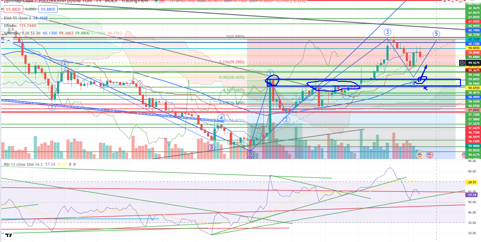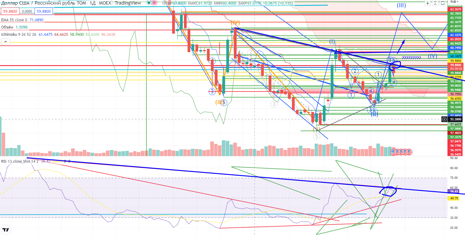 В итоге USDRUB на днях закрылся под 55EMA и трендом, RSI прямо под трендом, спекулятивный (!!!) лонг можно прикрывать. Вопрос о продолжении лонга только после прохода и закрепления выше 63,37+.