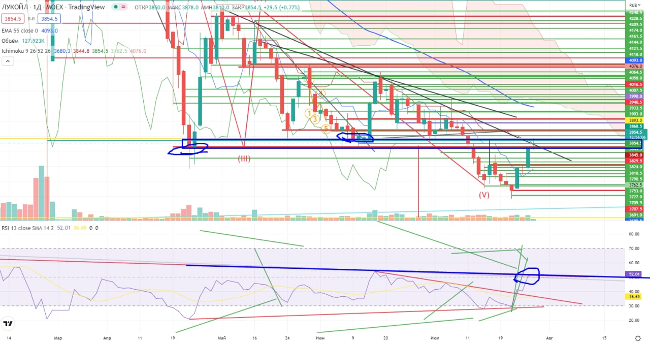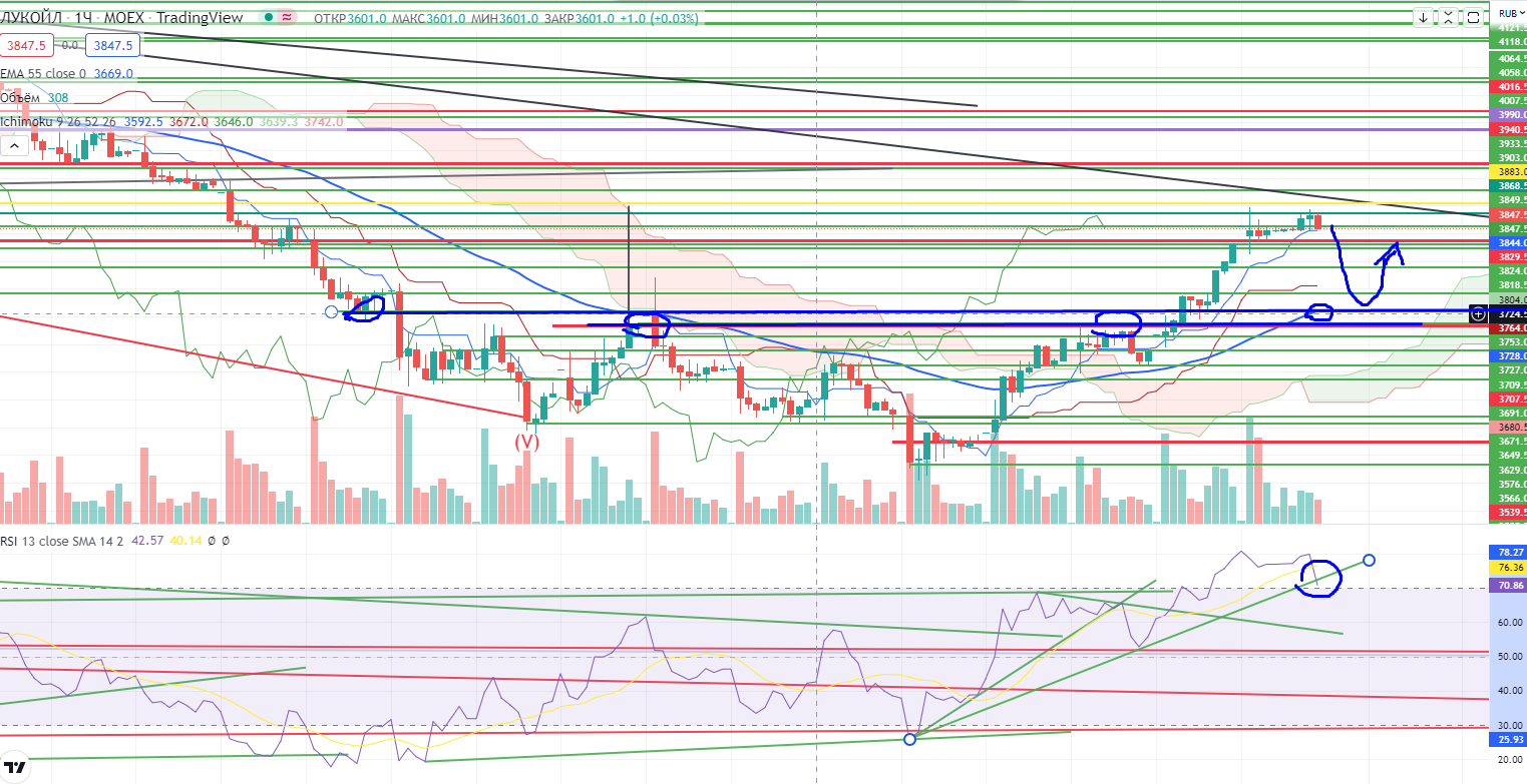 Лукойл на днях в зоне продажи 3828-3876, RSI под трендом. Я не призываю продавать, но закрывать лонги с коротким стопом на мой взгляд можно! Но на часах все таки нет дивергенции на хаю, поэтому поход вниз возможен, идеальная зона для откупки 3691-3727 (+55EMA), стоп 3680-