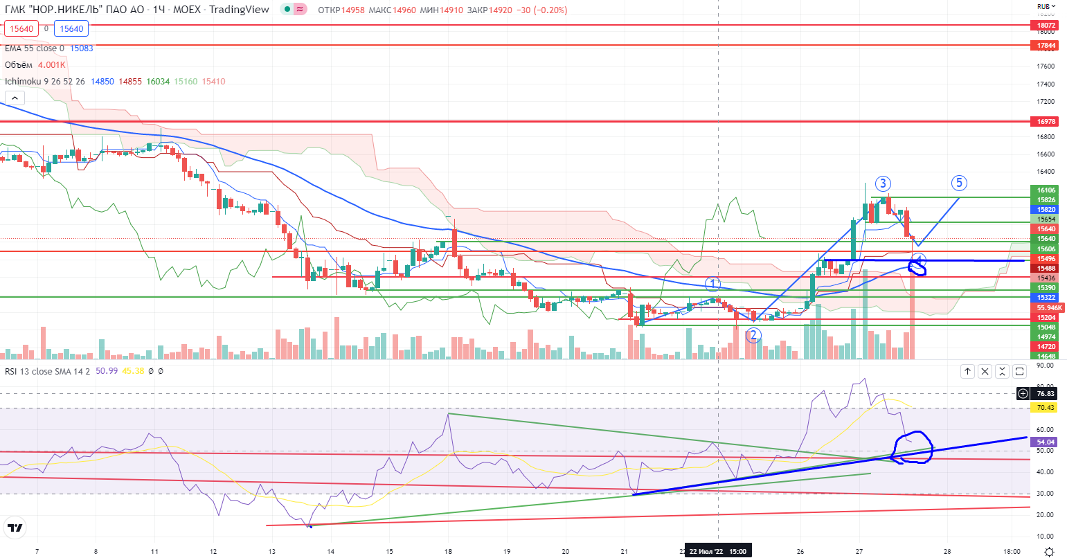 Накануне писал про ГМКН — «ГМКН на днях рисует первый мощный отскок, отрабатывая дивергенцию. Пробит локальный уровень 15200+, можно покупать! ГМКН на часах возможно зарождается 5-ти волновое движение вверх на часах, поэтому в принципе можно пробовать покупать по 15400+ со стопом 15300- или в зоне 14950 (+55EMA)-15050 с общим стопом 14850-. Я решил объединить эти рекомендации в одну, но стоп исполнять нужно по закрытию часа!». Первая поддержка сработала, на ней купил и остался в лонге на ночь.