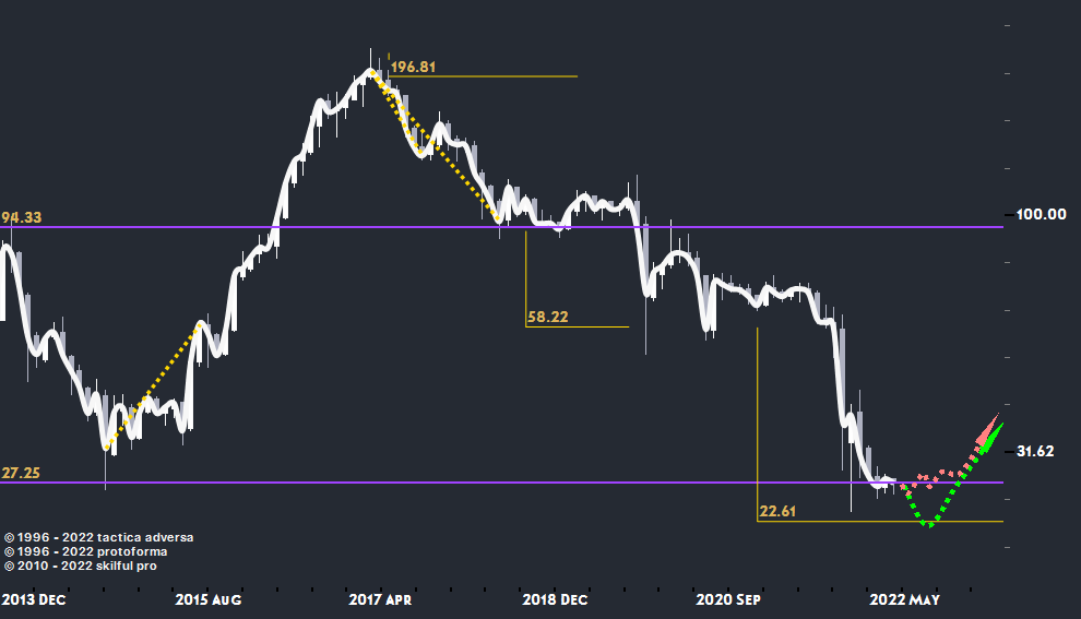 Отработав цели предыдущего импульса, подходим к целям нисходящей ЗMML (месячный план). Сценарии рассматриваю следующие, достижение целевого уровня и разворот или продолжение болтанки на годовой поддержки с разворотом. Восходящему импульсу может придать силу начало мирных переговоров.