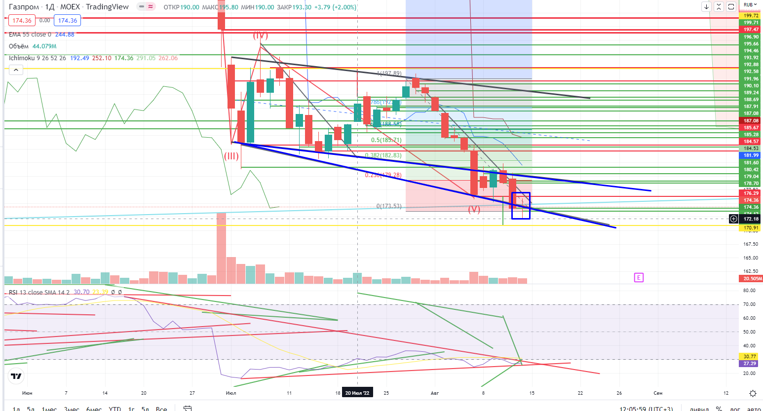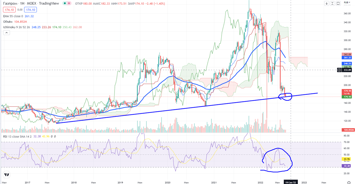 В Газпроме на часах прошел пробой уровня 176,3- (двойное лоу) вниз, в таком случае на ретесте этого уровня можно продавать со стопом 177,1+ и мишенью в районе 171±. Далее "дырка" до следующей зоны сопротивления 178,8-181,63 (там все, и 55EMA, и верхняя граница облака Ишимоку), можно снова продавать с общим стопом 182,4+, стоп надо исполнять, и даже можно начинать подумывать о покупке. И ТОЛЬКО ТОГДА МОЖНО БУДЕТ ТОРГОВАТЬ ОТ ЛОНГА, правда на чем туда могут вынести — огромный вопрос!!!.