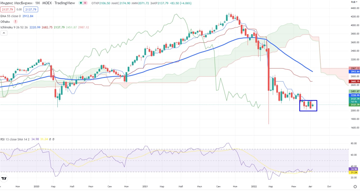 В Индексе ММВБ на днях при проходе зоны 2186-2226 возможно начнет работать формация "двойное" дно, но не раньше. Появляются сомнения в росте в моменте, т.к. на днях цена под 55EMA и облака Ишимоку, поэтому не жду в ближайшее время этого пробоя. Т.е. пила, широкая, но пила. Но со временем 55EMA и облако Ишимоку еще опустится, и вот тогда возможен полноценный рост. Индекс ММВБ находится между уровнями 2053 и 2186-2226, плюс еще возможный нисходящий тренд и конечно 55ЕМА и облако Ишимоку. Теоретически падать не к чему, но и расти без драйвера не можем.