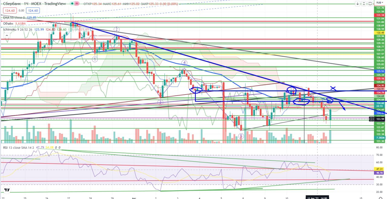 На USDRUB логичнее смотреть на дневном графике. Против лонга-нахождение под 55EMA, под реперным сопротивлением 61,62, RSI под трендом и вся эта конструкция находится в облаке Ишимоку. Пока приоритет у медведей. Проход и закрепление выше 61,7+ дает некий перевес быкам, но до следующего сопротивления 63,37-63,7. На днях пара доллар/рубль торгуется пока в треугольнике, внутри облака Ишимоку и "облизывает" 55EMA, и выход из облака может произойти 17-25 августа… Причем в любую сторону. А до этого момента все может быть. Ситуация на самом деле непонятная, поэтому либо не торговать пока, либо тупо стоять в спрэде, как я…