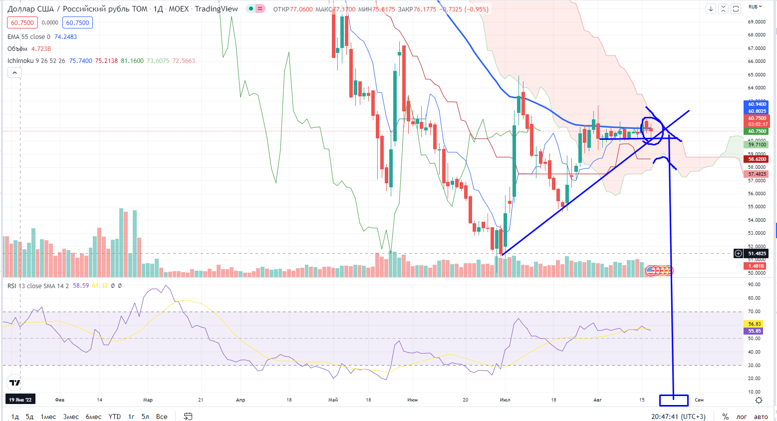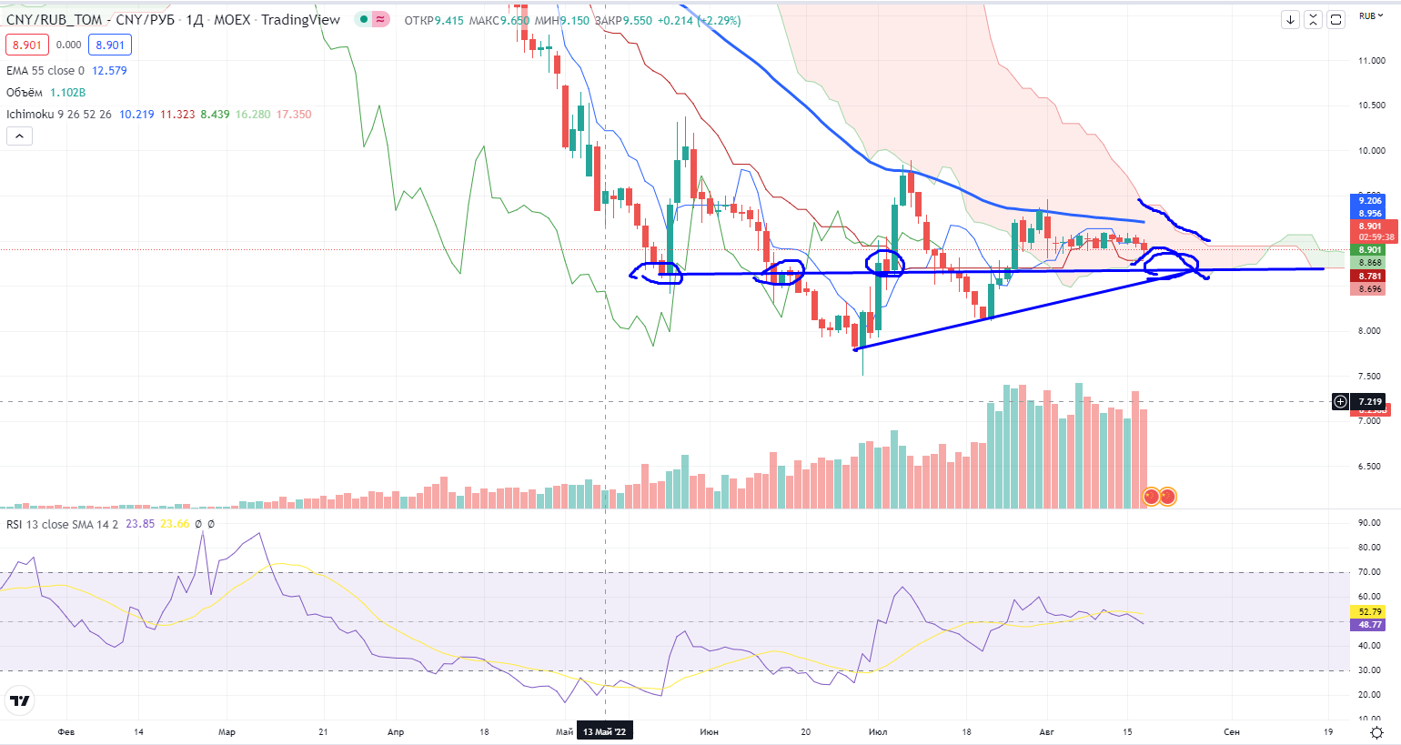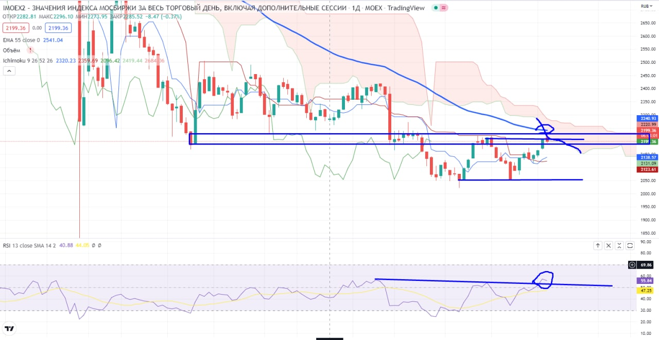 Индекс ММВБ продолжает находится в зоне непонятки 2186-2226 и конечно 55ЕМА и облако Ишимоку все еще находятся сверху. Можно спорить, почему не срабатывает «классический» ТА, но я уверен, что дело в 55ЕМА и облаке Ишимоку (я не случайно писал пост по поводу «классического» ТА ☝️).