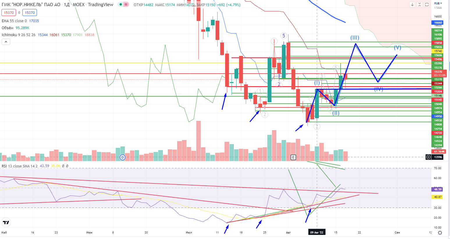 А вот ГМКН на днях (в отличии от Лукойла) еще может подрасти в рамках III-ей волны, до 55EMA и облака Ишимоку еще далеко. На днях он над зоной сопротивления 15150-15200, RSI пробил тренд. Стоит присмотреться к этой бумаге в плане лонга!