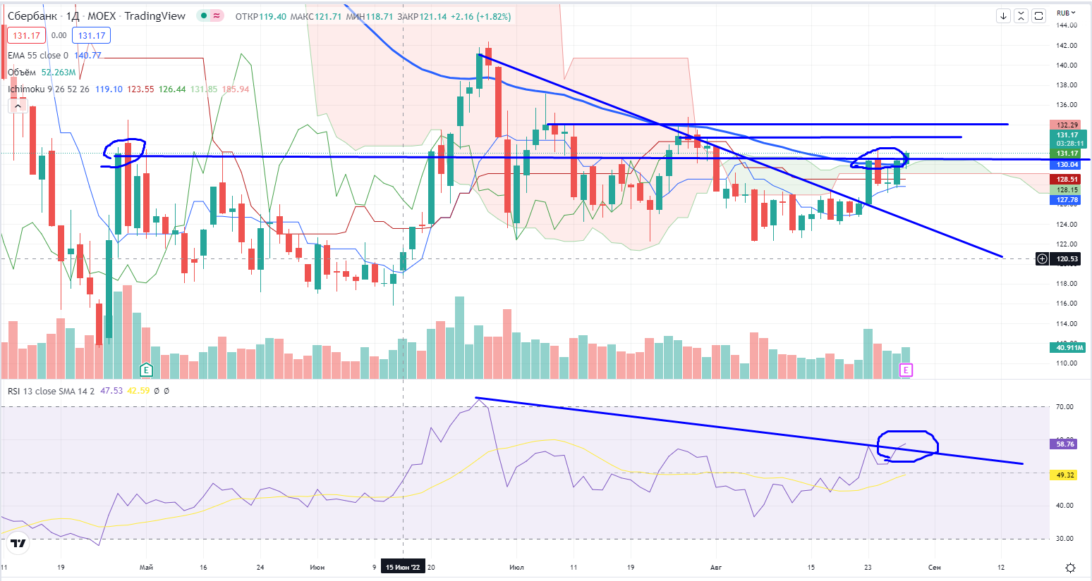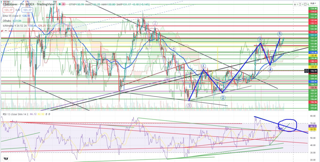 Дилемма в Сбере, на днях он пока под уровнем 131,11, но RSI пробивает свой тренд. На часах же RSI в состоянии дивергенции, но общий рост скорее всего «вынудит» и на часах сломать ее. Возможно, я поторопился закрыть шорт в Сбере, на часах цена на уровне, и RSI под трендом...Но закрылся, так спокойней, хотя формально надо было все-таки оставаться в шорте...