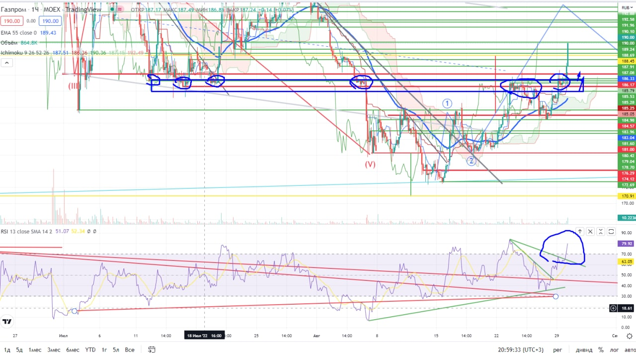 На «бумажном» рынке произошел наконец пробой вверх и все постепенно встает на свои места. Правда БЕЗ ДРАЙВЕРА. Инициатором стал снова Газпром. Пружина в Газпроме начинает распрямляться, ажиотаж вокруг энергетического кризиса в Европе дает свои плоды. За Газпромом потянулся и Сбер, и рост превращается в однородный. Судя по всему, я рост упустил, и что сейчас делать просто не знаю. НО БЕЗ КОРРЕКЦИИ ПОКУПАТЬ ТОЧНО НЕЛЬЗЯ!!! НУЖНО ВРЕМЯ ДЛЯ ПРОТОГОВКИ НОВЫХ УРОВНЕЙ!!!