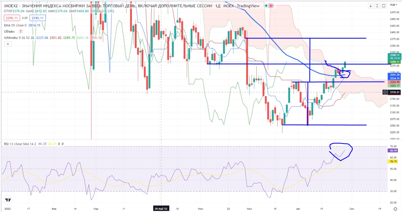 Индекс ММВБ проходит уровень 2282, и RSI ломает дивергенцию. Цена плотно выходит выше 55ЕМА и облака Ишимоку. Мишень от пробоя фигуры "Двойное дно" = 2372+- становиться реальнее.