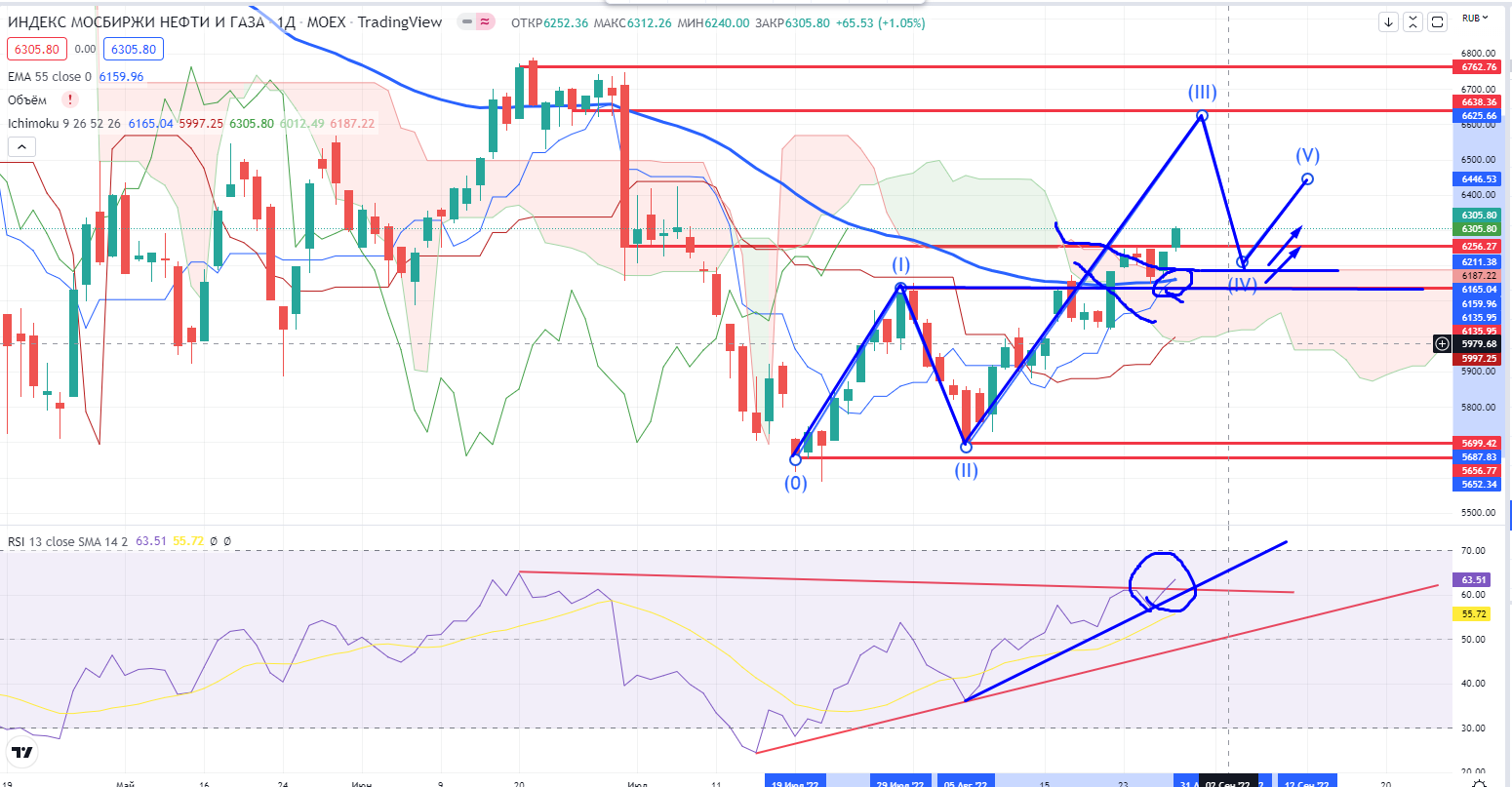 MOEOG (индекс Мосбиржи нефти и газа) на днях находится только в третьей волне роста, но на часах RSI в зоне перекупленности. Лонг можно прикрывать, откупать же можно пытаться в зоне 6129-6137, но может даже и выше (55ЕМА и облака Ишимоку). Это новая идея!!!