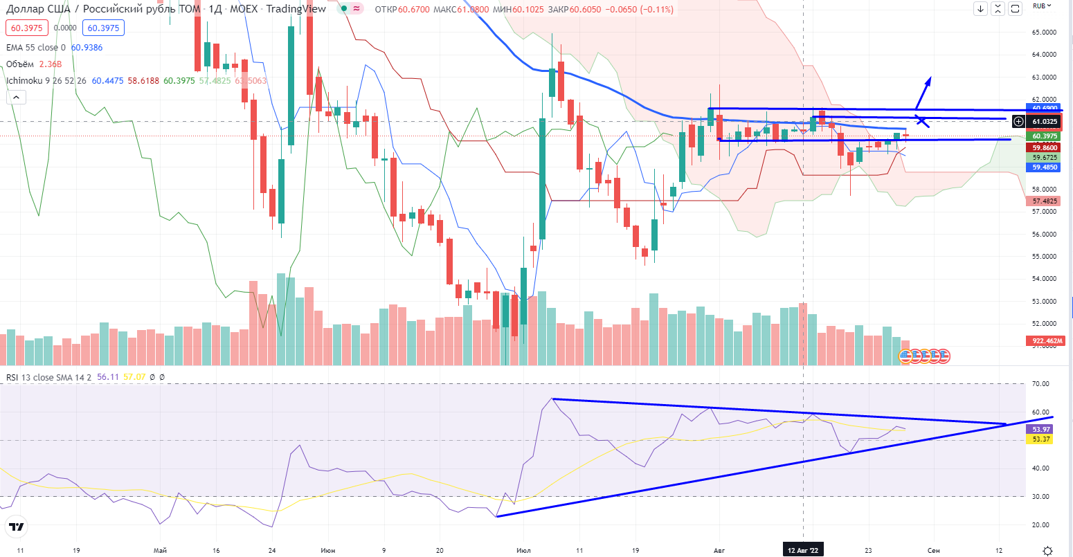 USDRUB пытается войти снова в канал 60,14 на 61,22-61,62, но под вечер и возможен ложный пробой (допускает условно +0,5% от 60,14=60,44), так что пока не стоит дергаться, но нужно быть готовым к торговле на этой неделе! В USDRUB на днях при закреплении выше 61,62+ можно покупать в зоне 61,22-61,62 с общим стопом 60,9-