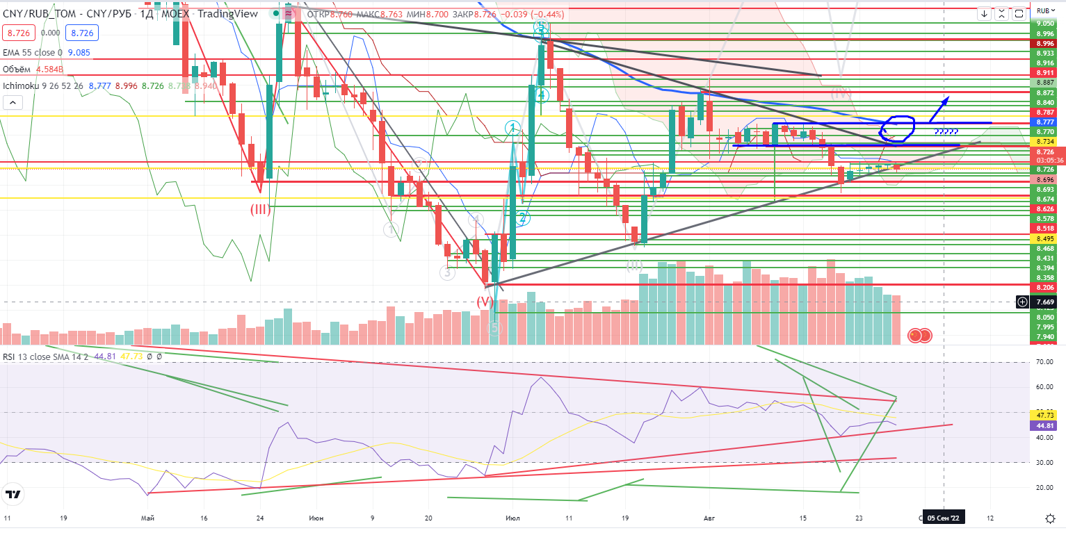 CNYRUB на днях под сопротивлением 8,92-, потом зона непонятки 8,92-9,09 (+55EMA), дальше зона лонга со стопом 9- ПО ЗАКРЫТИЮ ДНЯ!