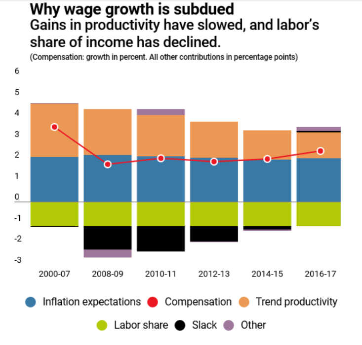 Экономическая теория предполагает, что компании, конкурирующие за сокращающиеся количество имеющихся рабочих, должны повышать заработную плату по мере ужесточения рынка труда. Специалисты МВФ задались вопросом, что же объясняет текущий низкий рост заработной платы? По их предположению правдоподобным ответом на этот вопрос может служить следующая диаграмма: