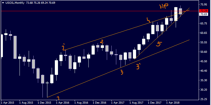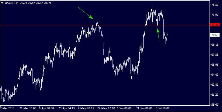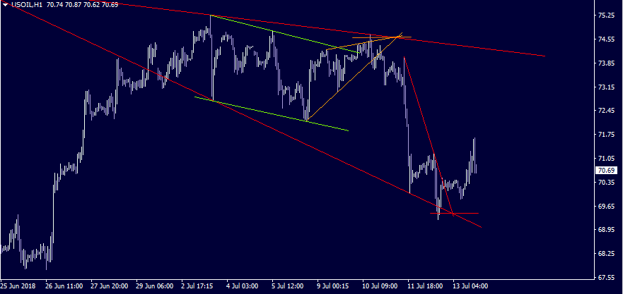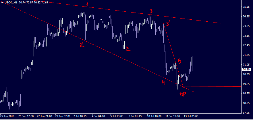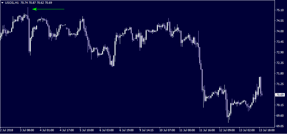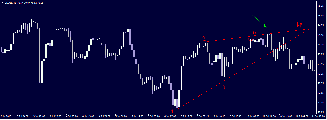 Берём часовой график CL, начало даун тренда отмечено зелёной стрелкой: