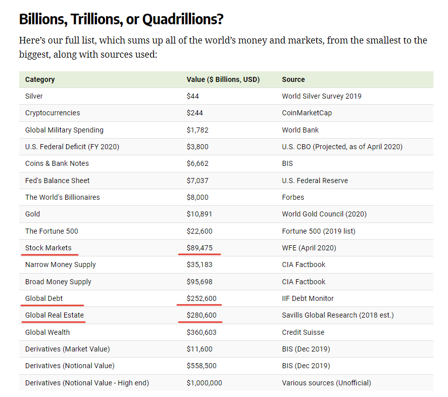 Недвижимость Рынок акций (все крупнейшие биржи мира) Глобальный рынок долга Глобальный рынок недвижимости All of the World’s Money and Markets in One Visualization 04.09.22 02:25 3147 Krop +1 Комментарии Нет комментариев. Ваш будет первым! Войдите или зарегистрируйтесь чтобы добавлять комментарии