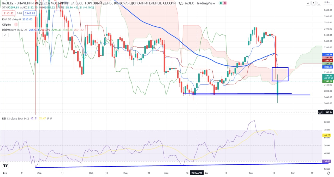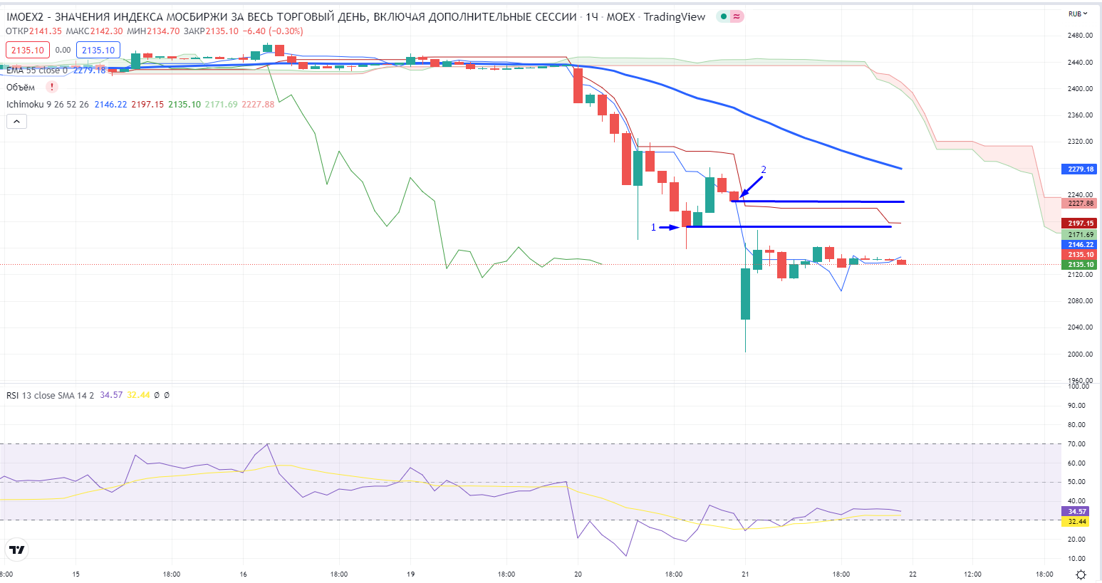 Индекс ММВБ на днях не только полностью закрыл гэп, и даже протестировал нижнюю поддержку в виде зоны 2053-2054. Формируется уже 4-ое дно с дивергенцией, шорты можно было по утру прикрывать. Сверху есть незакрытый гэп, который в теории должен быть закрыт, а вот что делать дальше совершенно непонятно. ДРАЙВЕРА ДЛЯ РОСТА НЕТ, отскок был чисто технический (на маржин-колах быков и закрытия медведями своих позиций), но впереди референдум по ЛНР и ДНР. Я думаю, что результат очевиден, а значит новые санкции и новое давление. И еще остались быки, которые в любой момент могут начать закрываться. Что-то советовать в сложившейся ситуации сложно. Возможно только интрадейная торговля!!!