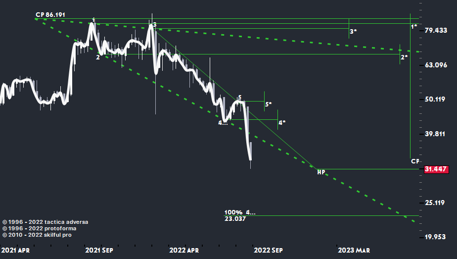 После начала СВО и затем проведения частичной мобилизации + угроз запрета покупать у РФ металл, цена акций Русала отработав цели модели расширения + 3МЛ рухнула, месячный план:
