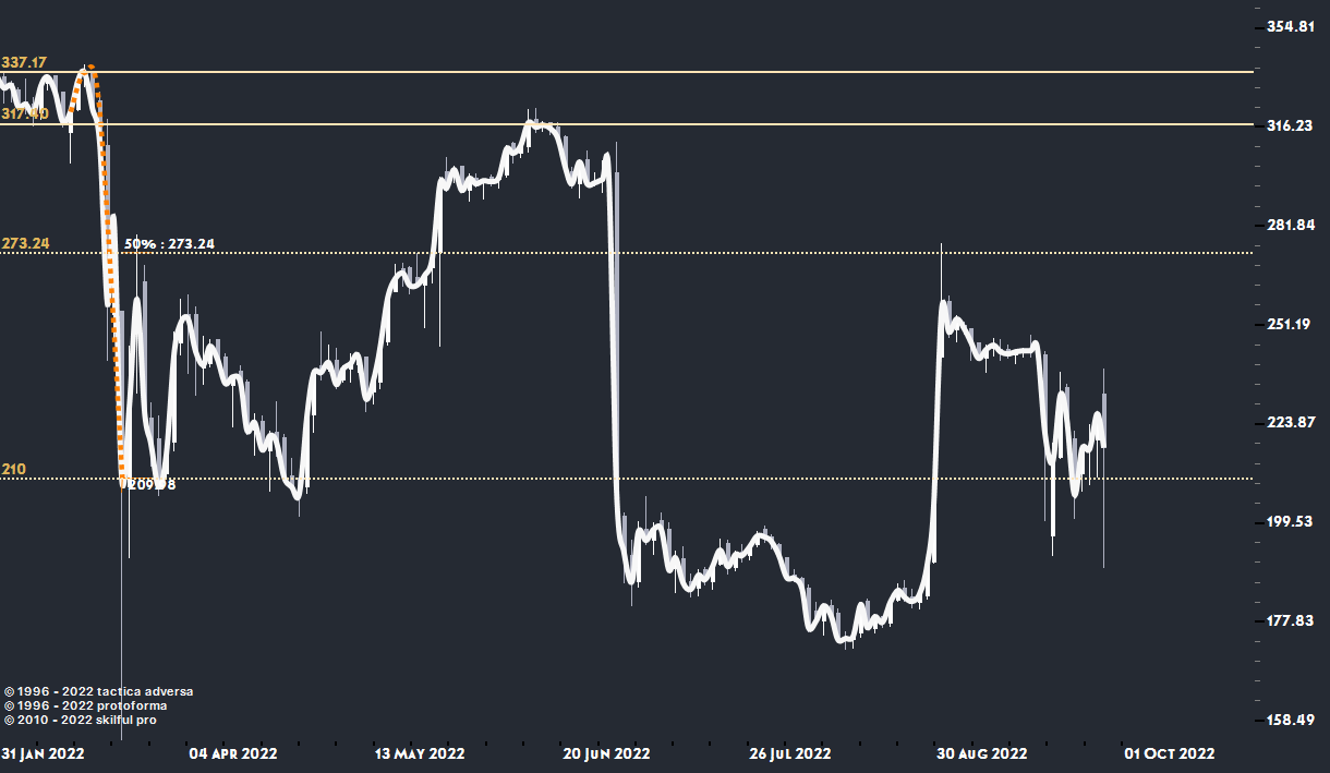 В случае Газпрома да и всего рынка российских акций изменение среды произошло после начала СВО и дальнейших событий, на что акции отреагировали соответствующим нисходящим движением и определёнными следствиям (игра в дивы к ним не относится) быстрая/резкая отработка уровня 50% затем попытка перелоя. Уровни и далее выступали как зоны сопротивления/поддержки, дневной план: