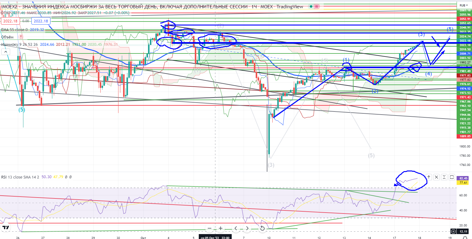 И судя по всему Индекс ММВБ на часах после закрепления выше 55EMA и облака Ишимоку просто так не отдаст "завоеванные" позиции и коррекцию надо откупать. Рекомендуемая зона 1967-1974... Но если снова распилят, я буду в шоке. Но подходит снизу к сильной зоне сопротивления, а с учетом перекупленности, коррекция может начаться внезапно, и может быть сильной...