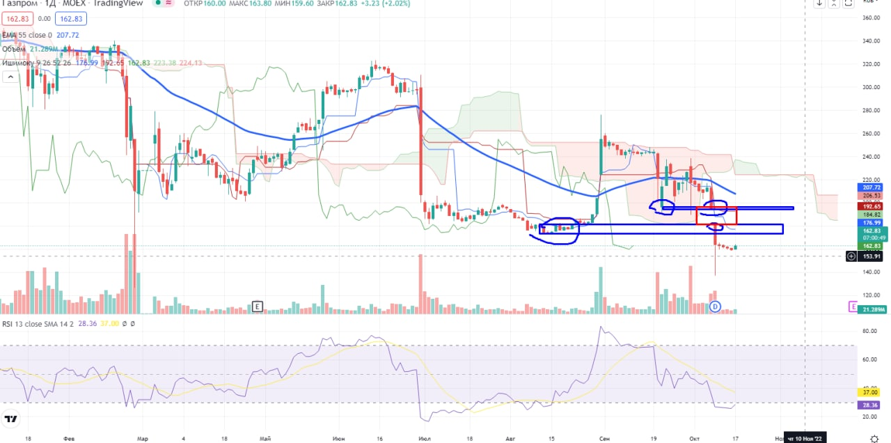 Честно говоря, дивидендный гэп в Газпроме спутал все карты. Я пока ничего не понимаю. «За» лонг-конфигурация дневного графика (есть повтор дна с дивергенцией и продолжение восходящего движения). «Против»-отсутствие (ИМХО) драйвера для роста. Для меня драйвером является окончание боевых действий, снятие (хотя бы частичное) санкций и госбабло. НО ЭТОГО НЕТ!