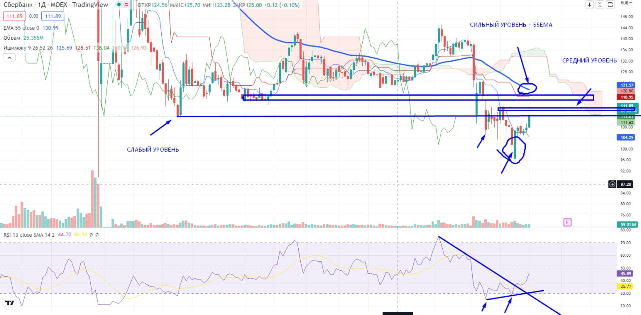 Сижу, анализирую дневной Сбер, вот такие уровни пока определил. 111,9 - слабое сопротивление, зона 114,35-115,1 - средняя и зона 117,5-119,4 - сильная (+ 55EMA подойдет к нему).