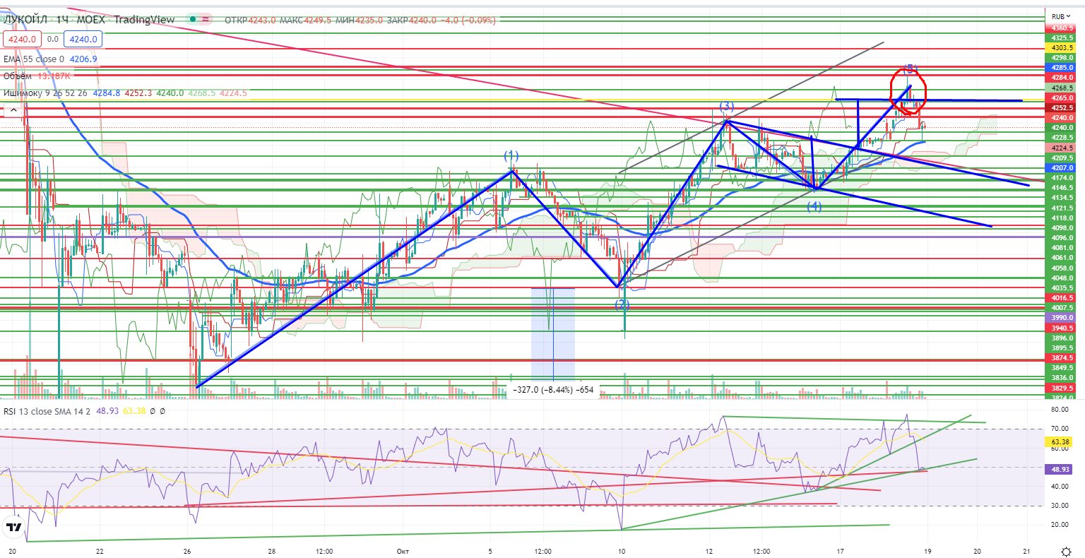 Кстати вот рекомендация и по Лукойлу, которую я дал еще позавчера под вечер, на канале — «Лукойл на часах пробил канал в рамках 5-ой волны, мишень = 4293+-, там можно лонг прикрывать!». Конечно никакого шорта нет пока...но возможно можно фиксировать лонги!!! На закрытии вырвали ложно вверх, но на «вечерке» статус кво был восстановлен!