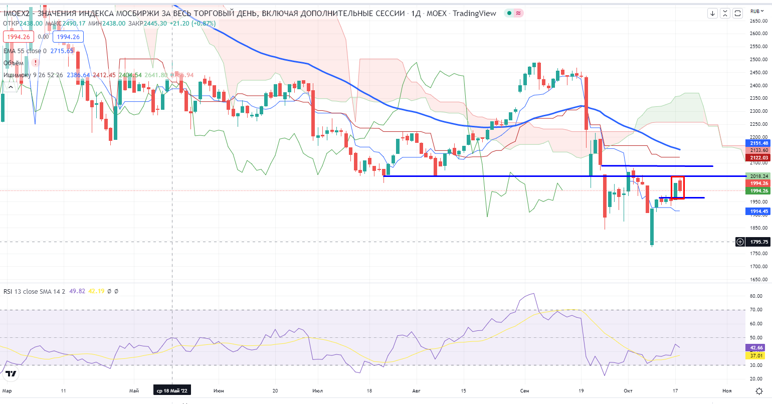 Индекс ММВБ рисовал в течении дня что-то на подобии «Повешенного» (разновидность Молота), что возможно является предвестником локального разворота, но на «вечерке» произошло падение. Все в рамках моих предположений, такая перекупленность должна быть снята. Для роста снова была использована вербальная манипуляция, что мобилизация «типа» закончена… Полный бред. При этом Госдума одобрила в I чтении увеличение налоговой нагрузки на газовую и нефтяную отрасли, т.е. о дивидендах в этих отраслях похоже надо забыть…