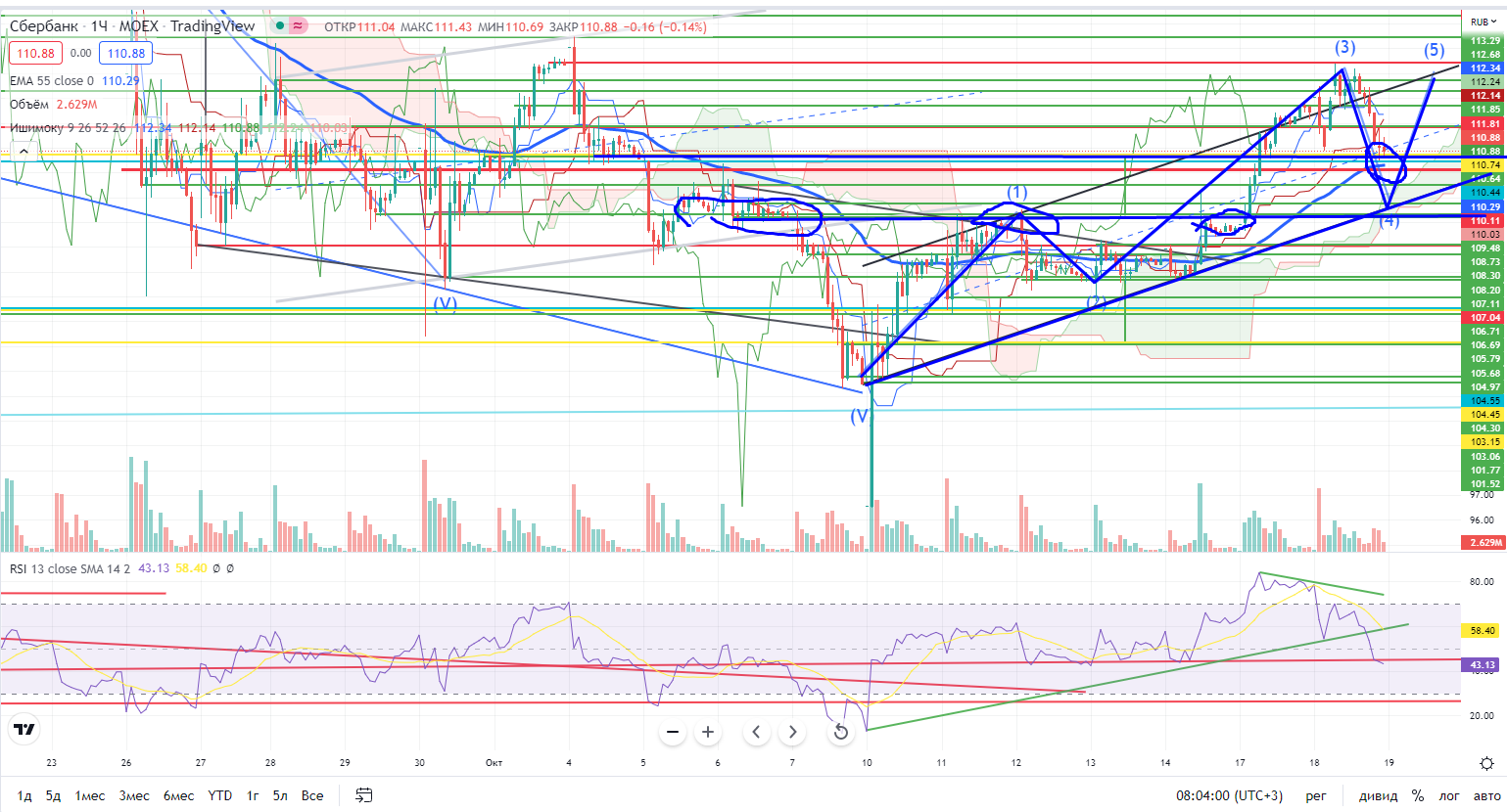 Сбер на часах под зоной сопротивления 113,76-114,42, но зона может быть расширена до 115,05, RSI в зоне перекупленности, шорт возможен со стопом 115,7+. Но цена выше 55EMA и облака Ишимоку, поэтому в случае коррекции можно покупать в зоне 107,89-109,55 с общим стопом 107,2-. Рекомендация действует и сегодня!!! Возможно можно покупать и выше (55EMA поднялся до 110,3+-), но стоп для меня ниже. Пусть я пропущу возможный отрост, но не буду лишний раз рисковать, еще не хватало распилиться от лонга с далеким стопом. С близким-можно рискнуть!!!