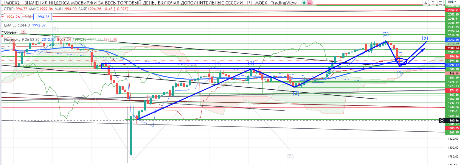 Надо понимать, что на часах сформировано окончание 3-ей волны роста, после коррекции локальная(!) тенденция все-таки скорее вверх, так что откат я «заставлю» себя покупать. Но на будущем отросте индекс ММВБ будет уже в 5-ой волне с дивергенцией, и вот на этом движении я рекомендую прикрывать лонги и даже спекулятивно пробовать продавать!!!