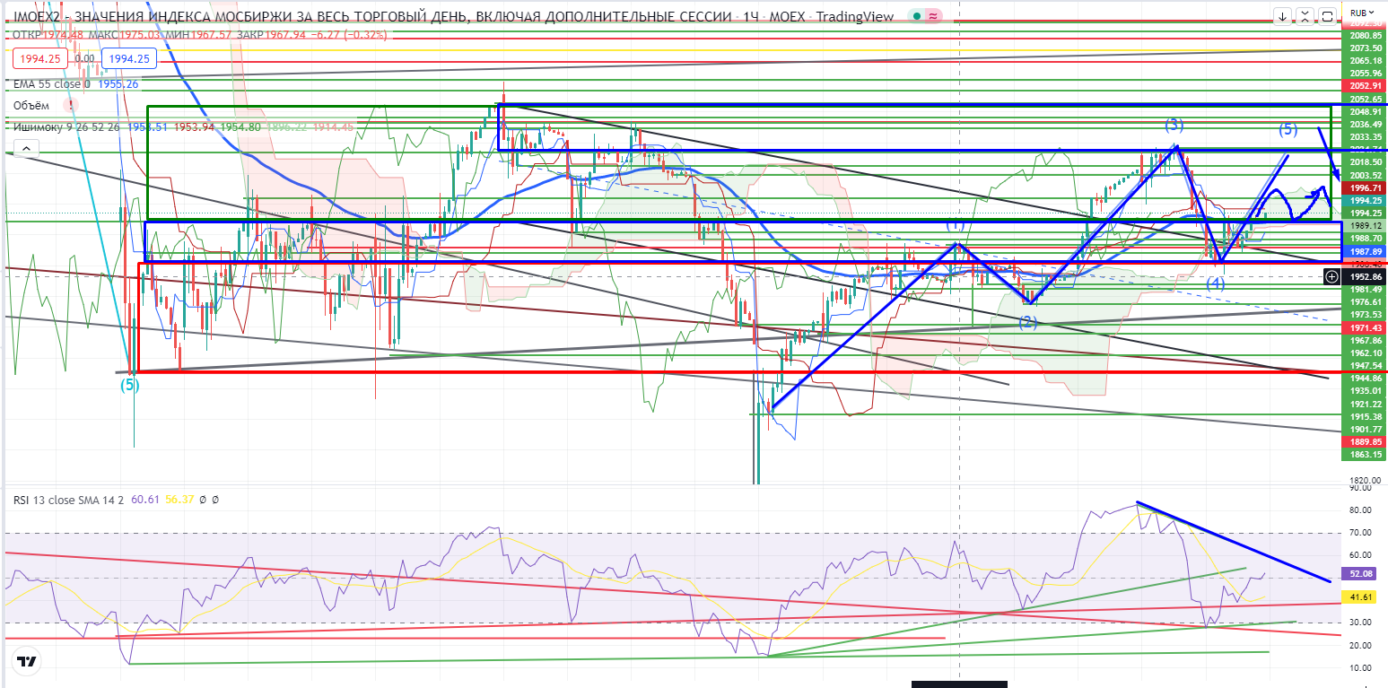 Самое неприятное, складывается такое впечатление, что Индекс ММВБ на часах "заблудился" в зонах. Первая-1909-1963, вторая - 1989-2064, и средняя зона 1963-1989 = 55EMA и облако Ишимоку. Сейчас как раз в этой зоне, а значит неопределенность возрастает и торговать в принципе нельзя с точки зрения стабильности. Надо дождаться выхода из зоны неопределенности и потом на коррекции торговать в сторону выхода....Но при этом надо помнить, что даже в случае роста индекс ММВБ войдет в 5-ую волну, и вероятность появления дивергенции крайне высока. В таком случае нужно прикрывать лонги и пытаться вставать в шорт. Я лично пока без идей, буду смотреть и действовать по обстоятельствам!!!
