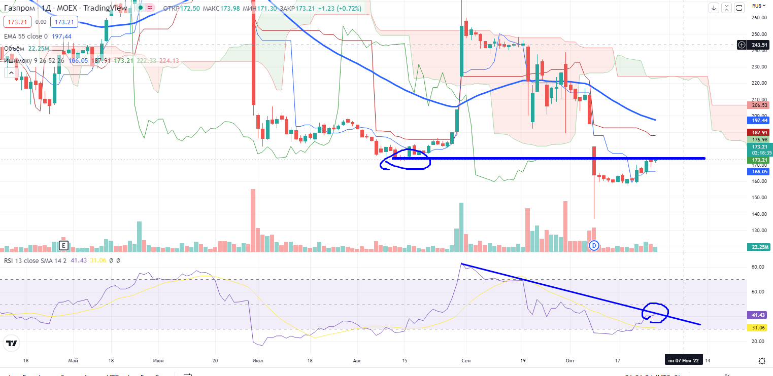 Также снова сработала пока идея в «Газпроме» — «На всей этой «бычьей» вакханалии «Газпром» на днях закрылся под уровнем сопротивления 174,1- и RSI под дивергентным трендом. Есть также незакрытый гэп 181,26-195,15. Лонговать крайне опасно, тем более есть дивергенция на часах, но лонг (если есть можно начинать прикрывать). Если бы не был пристально занят торговлей «Сбером» — вот отличный кандидат на спекулятивный шорт (стоп короткий)!». И т.к. вчера у меня не было такой большой позиции по Сберу, я решил и тут продавать с коротким стопом 175,4+ («В Газпроме на часах сформировалась 5-ти волновая формация роста, но цена выше 55EMA и облака Ишимоку + возможная реинвестиция в Газпром. Поэтому покупать можно в широкой зоне 168,36-169,75 (55EMA там же) со стопом 167,4-. Продавать же можно пытаться в зоне 172,75-174,5 с общим стопом 175,40+» — это цитата из моей рекомендации, которую я дал в телеграм-канале. )