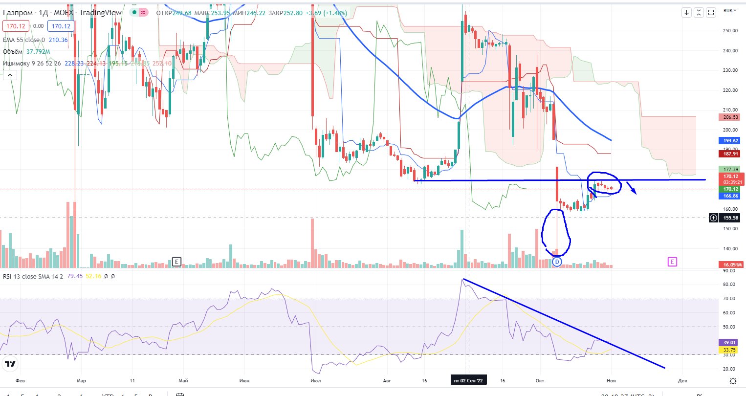 Газпром на днях тоже достиг своего локального сопротивления 174,36, но внизу есть непроторгованный шип. Наконец-то РФ допустили к месту диверсии с «Северными Потоками», размеры ущерба оценить сложно, так что лично хочу в случае похода наверх продавать эту бумагу под спрэд с лонгом в Сбере и (или) Лукойле.