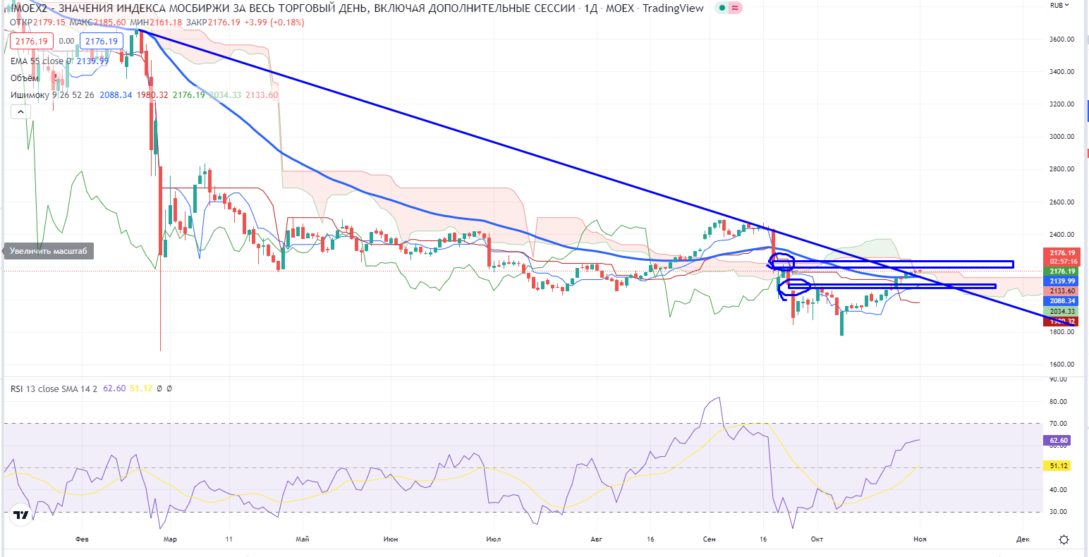 Индекс ММВБ рисует снова невнятную свечу, цена над 55ЕМА, над облаком и в рамках возможного канала с поддержкой 2053-2094 (первый гэп) на 2188-2230 (следующий гэп). Возможно будет тупо проторговка канала 2053-2094 на 2188-2230, а возможно и нет. Рынок пришел в пограничное состояние (многие бумаги 1-го эшелона находятся под своими ДНЕВНЫМИ сопротивлениями). Но цены выше 55EMA и облака Ишимоку на часах. Также не исключаю ложный проход вверх (а это классика разводки), а там нужно смотреть. Не случайно же Сбер и Лукойл снова под локальными хаями. Но могут и просто пойти вниз.