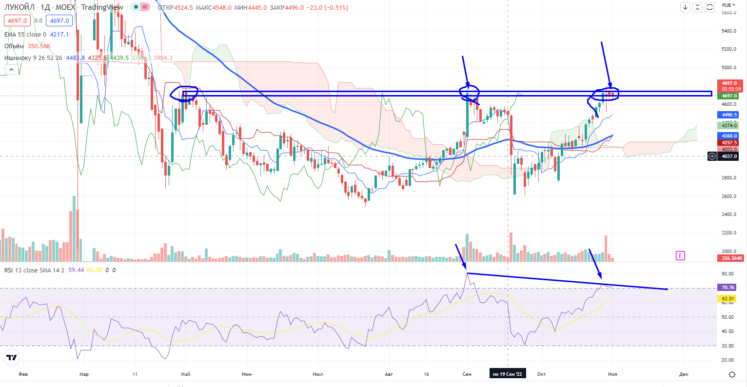 Лукойлна днях при всем позитиве можно увидеть двойную вершину на 4722-4724 с дивергенцией… А на часах Лукойл судя по всему тоже торгуется в канале 4657,5 (ур.+55EMA+облако Ишимоку) на 4725 (дневной уровень), мишени от пробоя вверх = 4792,5± (+1,59%) и вниз =4590± (-1,36%).
