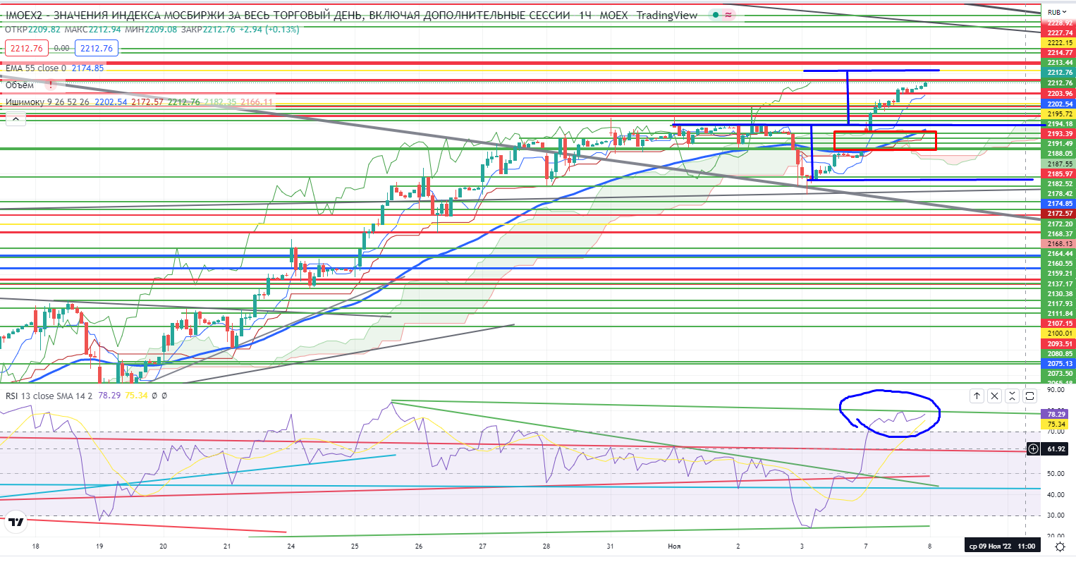 Индекс ММВБ на часах снова выше 55EMA и облака Ишимоку, но RSI снова в зоне перекупленности и есть незакрытый гэп (который необходимо закрыть (параллельно остудив RSI). Покупать снова опасно! Мишень от пробоя канала 2136-2178=2220+- еще не выполнена. НО RSI снова в зоне перекупленности, и коррекция очень возможна. Но т.к. рынок находится выше 55EMA и облака Ишимоку ее надо откупать!!!
