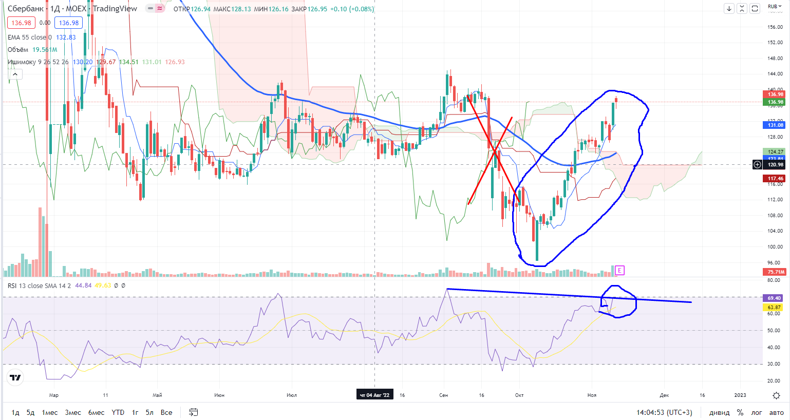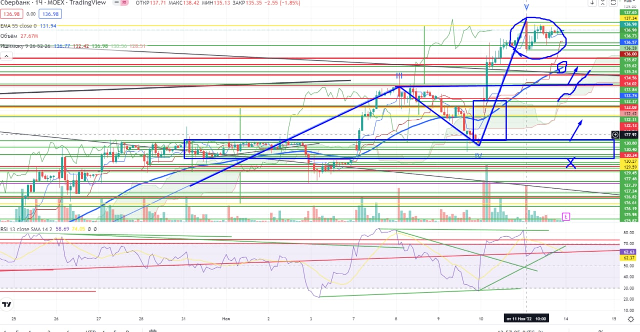 В Сбере на часах точного уровня сопротивление в "новом" движении я пока не вижу, надо ждать более точного уровня для определения стопов, цена выше 55EMA и облака Ишимоку, поэтому коррекцию надо откупать. Где-тоже большой вопрос, но крайний уровень для покупки 132+ (реперный уровень III-ей волны роста). Также ниже незакрытый гэп 127,3-131, он по идее должен быть закрытым, поэтому и там можно пробовать покупать с общим стопом 125,9-.