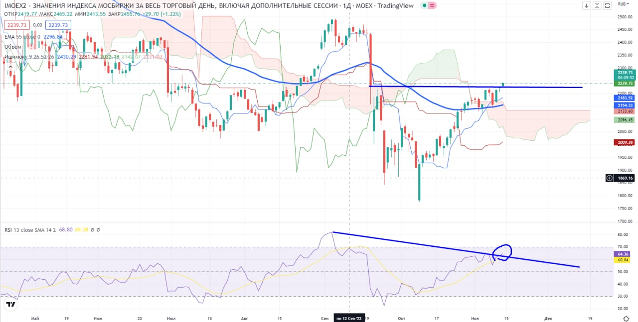 Индекс ММВБ продолжает рост и закрывается над уровнем гэпа 2230 и RSI пробивает дивергентный тренд. Вроде как все выглядит позитивно для нашего рынка. ЕС пока не готов обсуждать новые санкции против России, снова дивиденды и т.д. Из-за саммита G-20 возможно некая передышка в геополитической напряженности, НО… Мешает покупать рост накануне, «с нуля» покупать все равно очень опасно из-за перекупленности рынка.