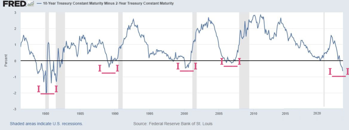 Инверсия кривой доходности является железобетонным предвестником рецессии, будущих экономических проблем и надвигающегося кризиса. На графике выделены 5 инверсий, которые в той или иной степени были предвестником начала кризиса и обвала фондового рынка. Последняя же инверсия - одна из самых мощных за последние 50 лет и как показывает нам история, ее отработка еще впереди!
