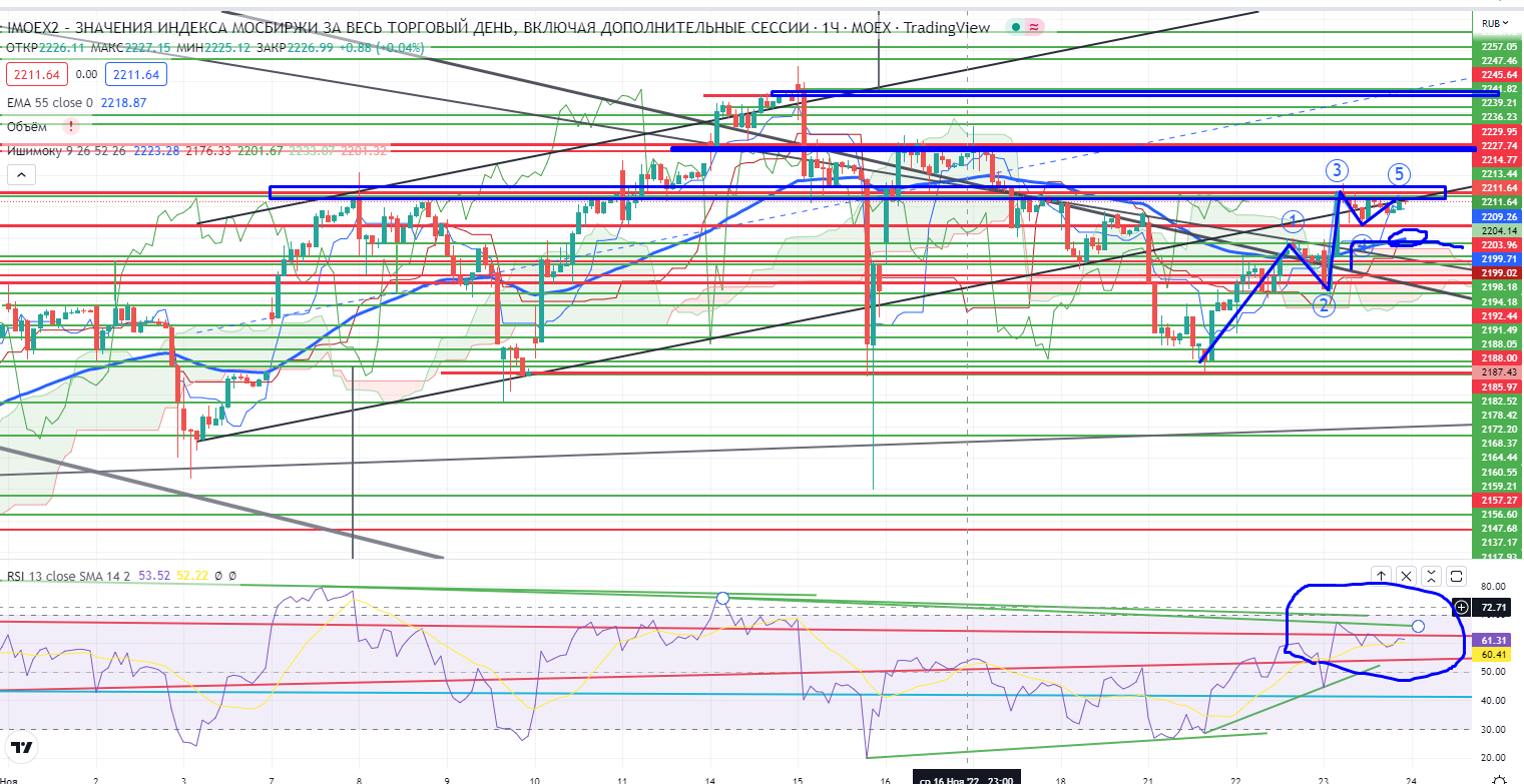 В Индексе ММВБ на часах возможно в один день сформировался 5-ти волновой отскок, причем цена пока находится ниже зоны сопротивления 2212 (чуть ее расширили, но не принципиально), RSI в случае повтора хая уже будет иметь дивергенцию, так что крыть или нет лонги - дело личное, но я снова постепенно становлюсь медведем ментально, но против «улицы» не попрешь!