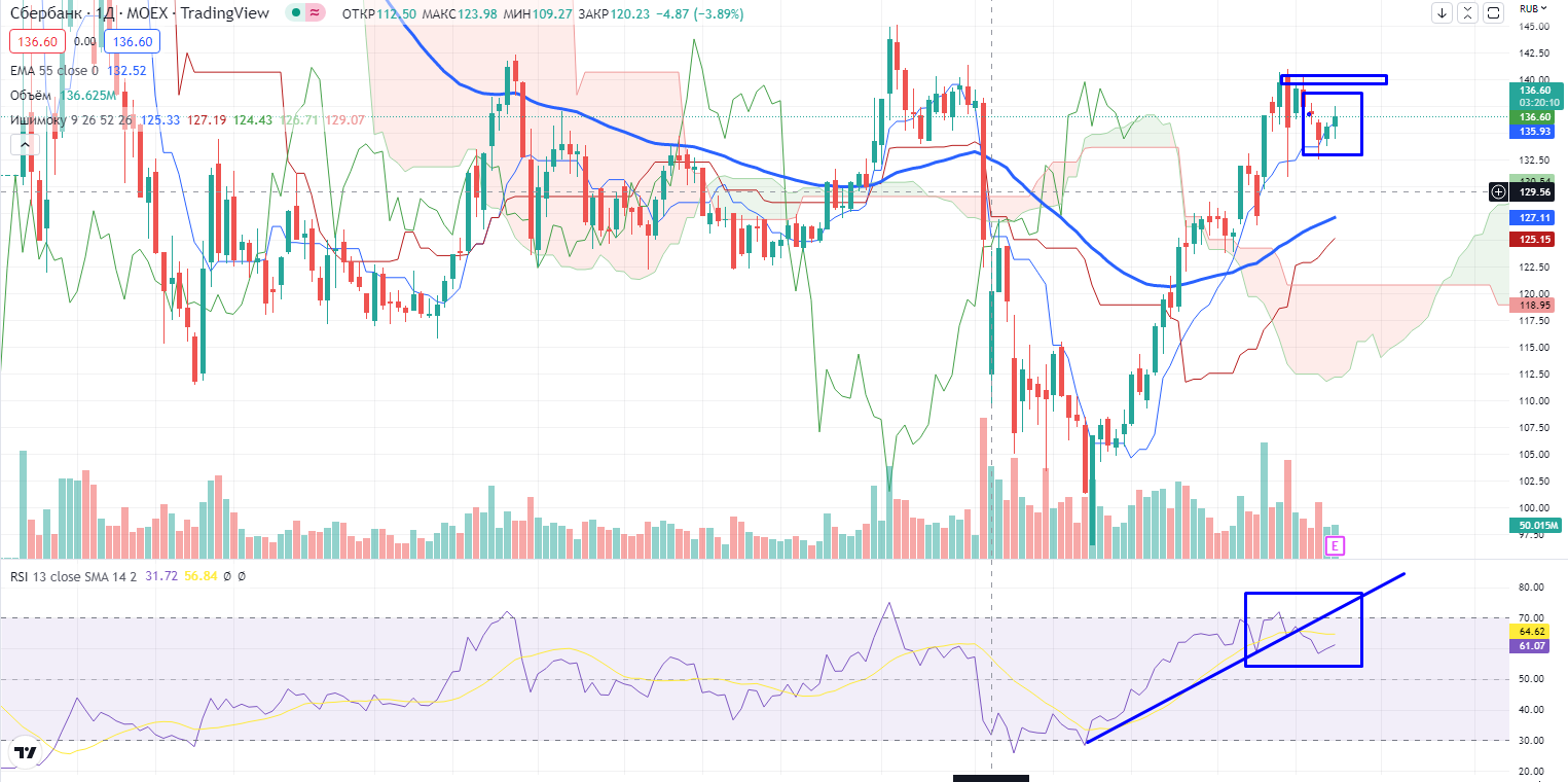 В Сбере на часах прошли и закрепились выше зоны 135,85-136, поэтому спекулятивно на откате можно покупать в этой зоне с общим стопом 135,4-. В этом случае я лично закроюсь и "на забор"! При этом RSI в Сбере на часах почти у зоны перекупленности и откат может произойти из любой точки (137,32, тренд 137,85+- или выше...). Крайняя зона продажи 139,6-140,5, вот там можно не только прикрывать лонги, но и продавать с общим стопом 141,1+ (писал об этих уровнях ранее).