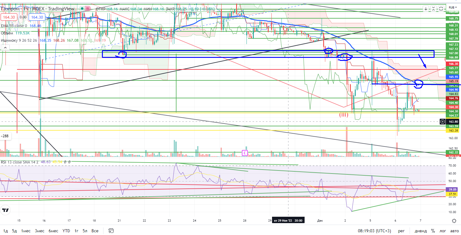 Хоть на часах в Газпроме 55ЕМА и опустилась до 165,8-, но на днях цена ниже зоны сопротивления 166,25-167,1, так что скальпировать от шорта можно с дневным стопом 168,2+.