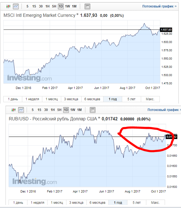 Рубль выглядит несколько недооцененным даже с учетом эффекта кэри трейд. В отличие от заметно подросших к доллару валют развивающихся стран (MSCI EM Currency) рубль все это время плавно ослаблялся. Вероятно, нацвалюта ощутит устойчивую поддержку ближе к концу года, когда завершатся плановые заседания ФРС и ЕЦБ (рубль исторически более чувствителен к внешним шокам по сравнению с аналогами). Думаю сценарий USD/RUB по 55 вполне вероятен. Нигматуллин Открытие Брокер